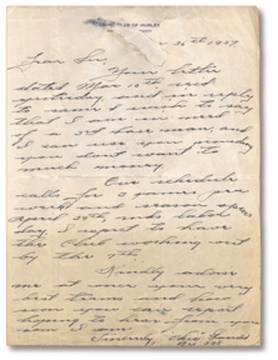 On the Chino Club of Hurley, New Mexico stationery. Reads: "Dear Sir, Your letter dated Mar. 10th rec'd yesterday, and in reply to same I wish to say that I am in need of a 3rd base man and I can use you providing you don't want too much money. Our schedule calls for 3 games per week and season opens April 29th, ends Labor Day. I expect to have the Club working out by the 7th. Kindly advise me at once your very best terms and how soon you can report. Hoping to hear from you soon. Sincerely, 'Chic' Gandil Box 525." Some repaired tears to the back and there is a hole that only affects part of the stationery and the month, no other writing. There is a bit of scrapbook residue on the back that can be removed. Hole has been repaired and the letter is o/w in excellent condition (8.5x11"). Otherwise a very pretty letter with a beautiful signature at the bottom. Gandil had beautiful and very interesting handwriting.