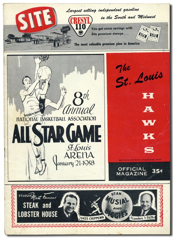 The 32-page, staple-bound program (EX) for the 1958 NBA All-Star Game is a basketball history lesson in one rarely found package. The NBA was never an organization to shrink from advertising, as these ad-packed pages attest. Stan Musial and Biggies' steak and lobster house gets a prime cut at the bottom of the cover. The brewery-ful of beer ads makes sense because the game was in St. Louis. As the rosters and scoresheets for each quarter (!) show, the East was represented by Bob Cousy, Bill Sharman, Bill Russell, Dolph Schayes and other luminaries. The West featured local Hawks heroes Slater Martin, Cliff Hagan and Bob Pettit, who signed the autographs section, plus Maurice Stokes. Oldies but goodies -- and no baggie shorts.