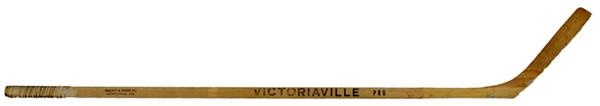 What could be more valuable than an Orr-signed stick used in the early '70s when he rewrote the record book? This Victoriaville Pro model was in his hands for at least some game action during that period when he garnered the most famous goal in hockey history -- that spectacular swan-dive red-lighter against the Blues on May 10, 1970 to clinch the Cup -- and surely had some role in his 6 straight 100-point seasons. Just perhaps Mr. Orr used it when he became the 1st defenseman to cop an NHL scoring title (33 goals, 120 points in '69-70). The signature on the stick is just down from the handle in black marker and is vintage, not added years later, somewhat faded but still a good 7/10. "B. Orr" is stamped on the shaft and his famous number "4" written in marker above it. "Mailhot & Freres Inc. Victoriaville, Que." stamped on handle just down from the trademark tape on the knob end. Good use, with markings and soiling on the tape, all intact save for a piece of the bottom of the curved blade that is missing, o/w consider this a perfect Orr stick from his wonder years.