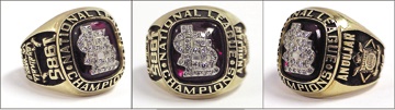This comes directly from one of the best pitchers of his time. Magnificent 10k gold ring boasts a lustrous face with figural image of the Cardinals "StL" studded in diamonds. Inset against red stone encircled by the words, "National League Champions". One shank pictures the Cardinals perching logo with 1985 above. The other, the classic National League logo with "Andujar…46". This is a perfect size 10.25. Near mint condition. It is rare to have a ring from a player let alone one who was critical in getting them there (21-12).