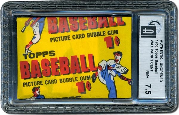 Unwrapping (if you dare) this extremely rare 1956 Topps baseball penny pack (NRMT+ 7.5) would reveal one of the company's aesthetic hits on its cards: a face shot silhouette next to a photo sketch actioner signed by the player. The photography was mostly old in the 340-card set, so Topps got creative. Double cheers to you if a Mickey Mantle, Ted Williams, Roberto Clemente or Ernie Banks is snuggled inside the wax wrapper. Alternating pitcher and batter motif covers the yellow background. That's a lot for a penny. Please don't open it though as it's one of the rarer penny packs around.