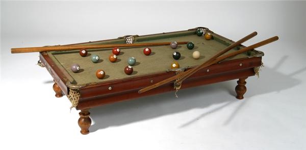 This impeccably-crafted scale model billiards table from the early 20th Century stands 20 x 36 x 8" and was perfect for table-top family matches in the den, or perhaps more serious 8-Ball, Rotation or 1-Pocket action after the kiddies went to bed. The salesman sample table was manufactured by the Wallie Dorr Company of New York, one of the country's top toy and game companies at the time. Solid wood with a hand-finished, silver castings on the outer frame, hand-crafted legs and a green felt playing area with netted pockets. Even the top is real slate. Wallie Dorr sticker on the side has partially rubbed off but the company is also identified on the underside. Includes three (3) 36" long cues and a full set of 15 numbered balls and the cueball, which come in the original 4 x 4 x 9" wood box. Table is overall EX, cues and balls NRMT.