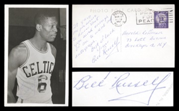 Stunning real photo postcard of the greatest of all. Signed "Bill Russell" on the front in blue ink. On the verso is a note, "It gave me pleasure to know that you cared enough of me to want my autograph. Best of Luck, Yours, Bill Russell." He has addressed it as well to gentleman in Brooklyn. 1957 Boston postmark. Contrast on front signature not great but verso note is NRMT. Postcard itself is EX+.