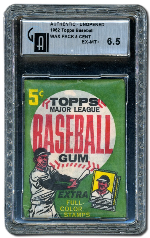 The 1962 season ended with McCovey lining out to Richardson. But it began with one of Topps' cooler editions. Even the wax wrapping on this unopened pack is a classic. An anonymous player looking like he's swinging at the re-introduced stamp set gets the blood stirring. Who will be inside? Koufax? Marichal? Mickey? One of the 10 Babe Ruth biography cards Topps introduced that year? We love the description of the contents on the back under the Bazooka ad: "1 Slab Gum Plus Picture Cards." That's all you need. The '62s were Topps' biggest issue to that point, with 598 players, plus a few variations. Maybe you'll tear this open and look for those elusive high grade 62s? Nah, keep this one closed for investment purposes. Either way it's a fantastic pack from a very desirable year. Graded GAI 6.5 EX-MT+.