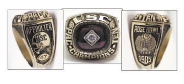 Genuine player's ring was a college athlete's prize for achieving one of the NCAA's highest goals. Faux diamond rests at center of red stone on face, with raised text surrounding, "USC PAC Ten Champions." Left shank has players name and number "Affholter 47" with helmet image. Right shank has image of the famed stadium with "Rose Bowl 1985." Size eleven.