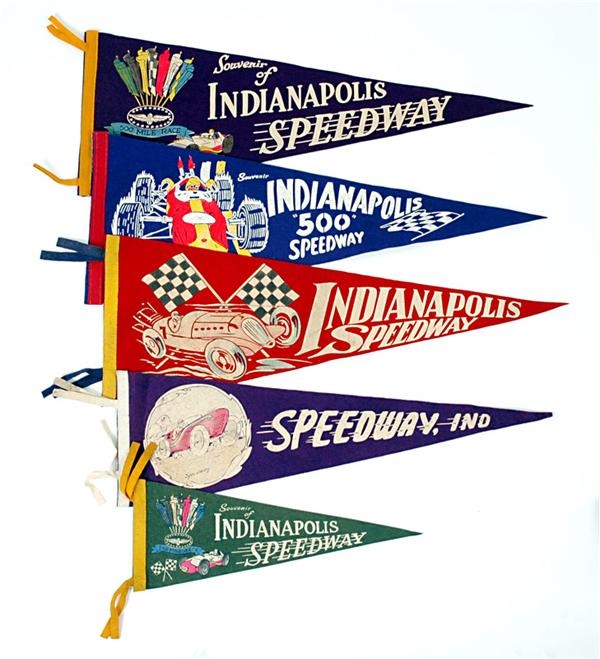 Brickyard buffs will want to raise these flags for sure. Heck, what better symbols of the Indianapolis 500 (or any racecar) history could there be? The 5 classic, multi-colored felt souvenir pennants from the famed race venue range from the 1940s to the '60s and read "Indianapolis Speedway", "Speedway, Ind.", "Indianapolis Speedway" (2) and "Indianapolis '500' Speedway", with each embellished by delightful images of vintage racers, checkered flags and other racing bric a brac. All pennants EX+ or better.