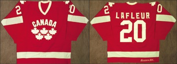 The Canadiens were quickly eliminated from the NHL playoffs in 1981 and Lafleur immediately joined the Canadian National Team in Sweden for the World Hockey Championships. This heavy mesh red Sandow jersey was worn by Guy during this international tournament. The uniform has the number "20" (#10 was already taken) screened on back and sleeves and the Team Canada logo screened onto the front. The name is sewn onto the back. Shows light but evident game use. LOA signed by Guy Lafleur.