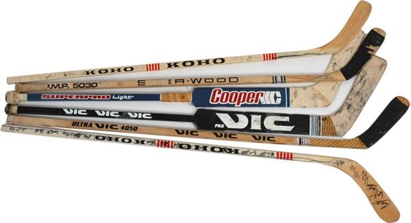 Open your own stick wing or Rangers shrine with a collection of 28 game-used sticks wielded by the skating inhabitants of Madison Square Garden. Nothing says Ranger love like a massive lot of puck whackers that pounded slap shots -- and repelled them -- in the storied history of the Blueshirts. They're black, red, blue, silver. They're battered and taped with grime. They're Easton, Vic, Titan, Cooper, Louisville, Canadien and Northland. They're Richter, McClanahan, Gartner, Sandstrom, Granato (a Koho that's covered with autographs (8/10, including Brian Leetch's). They're anonymously owned, too, like a Northland brimming with signatures (8/10), including Captain Barry Beck. They're even Guy Lafleur, who made the Rangers better by playing against them. They're Froese and Helminen. They're yours.