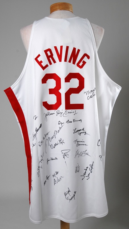 Without Dr. J, the ABA would have been a red, white and blue lemon. With him, it could claim a patent on the take-off-from-the-foul-line dunk, the up-and-under-high-off-the-glass reverse layup and grain-silo-high Afro. Erving's star-studded New York Nets jersey from the funky old ABA days is always an in-demand item and this beaut is signed by him as well as 24 other ABA stars such as Moses Malone, George Gervin, Artis Gilmore, James Silas, Marvin Barnes, Rick Darnell, Jumbo Jim Eakins and others who turned back time at the 2005 NBA All-Star Game. The names are just waiting on this Mitchell & Ness throwback to jog your memory of Colonels, Squires, Spirits of St. Louis and other gentleman who bucked tradition in high-flying style.