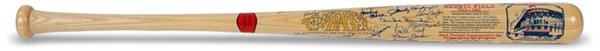 This Ebbets Field commemorative bat is saturated with the signatures of no less than 64 "Boys of Summer", making it one of the finest and most delightful pieces of Brooklyn Dodger memorabilia around. Cooperstown Bat itself is a keeper with its image of Ebbets on the barrelhead next to a short bio of the park. Signatures are in blue Sharpie and include Roy Camanella, Sandy Koufax, Duke Snider, Pee Wee Reese, Don Newcombe, Billy Herman, Carl Erskine, Johnny Podres, Ralph Branca, Eddie Stanky, Billy Loes, Andy Pafko, Gene Hermanski, Sandy Amoros, Shogtun Shuba, Frenchy Bordagaray, and many more. Signatures and bat are NRMT.