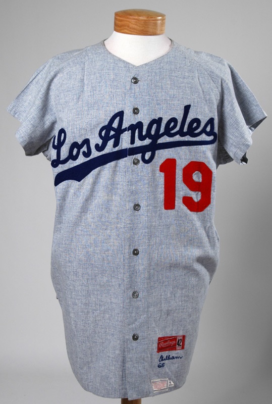 This 1966 Dodgers road jersey helped get Jim Gilliam, a classy multi-position player who won four World Series titles, through his final season. Sweat around the collar, a frayed felt No. 19 on the back and dirt stains provide the endearing game-used touches while the "Gilliam 66" embroidered below the Rawlings Size 42 label gives it the personalized magic. The blue-woven gray flannel with extra-short sleeves looks far sharper up close than it did on TV's Game of the Week. "Los Angeles" script across the chest is a classic and the red felt number below provides sparkling contrast. Whether in their private jet or in their uniforms, the Dodgers knew how to travel in style. They lost the World Series in four straight games to the Baltimore Orioles in '66, but Gilliam could retire in peace, knowing he was an essential part of a special era. This jersey, which comes with a letter of authenticity, provides an important link to the Dodgers' greatest years. They were rich in pitching and in players who quietly got the job done. Nobody epitomized the latter more than the man they called Junior.