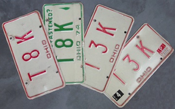 Set of four Ohio state license plates rode the bumper of the hard-hitting fan favorite. Two of the plates read, "T 3 K" while the other two are "T 8 K," relating to Klu's initials and numbers he wore on the field of play during his career. Slap these on your car and go. LOA from Klu's wife.
