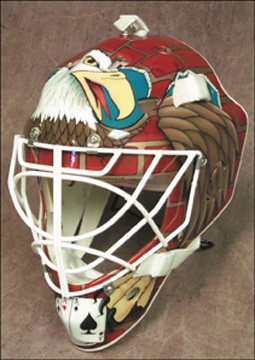 Jim Carey's pro molded mask worn with the Caps during the 1995-96 NHL season. Gorgeous style with the American eagle at top and clutching three aces at the bottom. Brick wall style with "Ace" on the headpiece at the back. Signed on the inside (faded), "Made For Jim 'Ace' Carey" with signature of maker and dated "10-95." Letter of Authenticity.