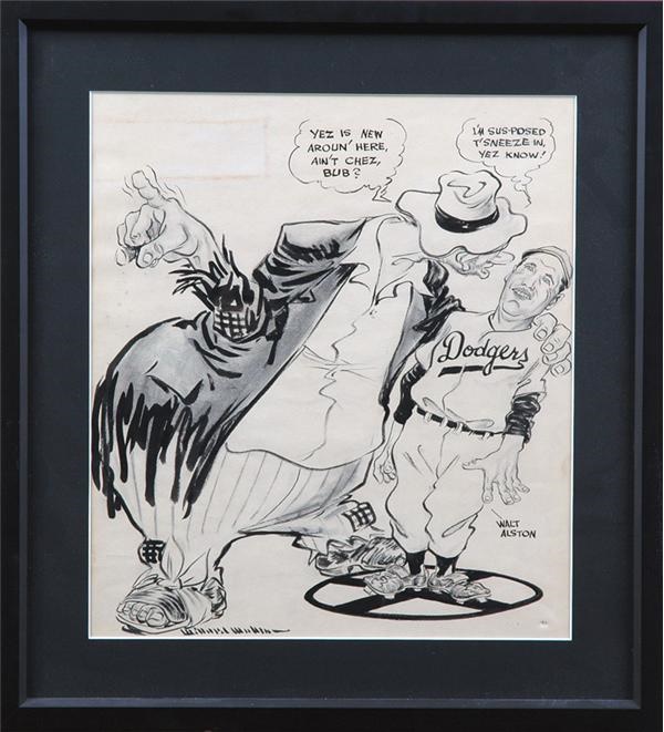 Willard Mullin was essential to the Brooklyn Dodger experience, his memorable image of the Brooklyn "Bum" in the New York World telegram's sports pages became the team's quasi-mascot and nickname for the last two decades of its life at Ebbets Field. This great original drawing by the "Dean of Sports Cartooning" ran in The Sporting News on December 9, 1953. It shows the Bum welcoming new Dodger manager Walter Alston, who looks a tad overwhelmed by the big busker's attention -- a typically warm and playful Mullin scenario. The dimensions of the drawing (13 3/4 x 15") are also typical of a Mullin drawing, as he worked on large surfaces employing pen and ink, brushwork, and conte crayon on coquille board. His signature in itself is a work of art comprised of 26 primarily vertical pen slashes. Drawing is in NRMT condition and mounted against a black background in a 19 x 21" black frame. Any original Mullin is a real prize, and this is one of the best we've handled. Includes original copy of The Sporting News page with the cartoon.