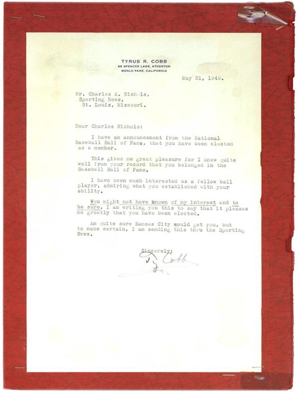 Content, content, content. Startling letter dated May 31, 1949, and typed on Ty Cobb’s Menlo Park, California stationery. The still arrogant Cobb acts as a semi-official emissary for the Baseball Hall of Fame (he was the greatest living player) informing Kid Nichols he has been elected to Cooperstown. To “Charles A. Nichols” this quite official sounding document states: Dear Charles Nichols: I have an announcement from the National Baseball Hall of Fame, that you have been elected as a member. This gives me great pleasure for I knew quite well from your record that you belonged in the Baseball Hall of Fame. I have been much interested as a fellow ball player, admiring what you established with your ability. You might not have known of my interest and to be sure, I am writing you this to say that it pleases me greatly that you have been elected. Am quite sure Kansas City would get you, but to make certain, I am sending this thru the Sporting News. Sincerely: Ty Cobb (signed).” Beautiful mint signature in black ink. Letter is affixed to scrapbook page (could be removed) and has some light stains at the corners which may lighten when removed from the page.