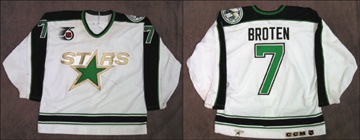 Beautiful gold braid "Stars" across the front with green star most dominant. The jersey features the "NHL 75" patch as well as the "North Stars 1967-1991" Anniversary patch. Maska tag in collar with "50" size tag. Fight strap in the tail, nice use including stick marks. Broten's name crosses the back above the number. Purchased from Byron's Hockeyland with documentation.