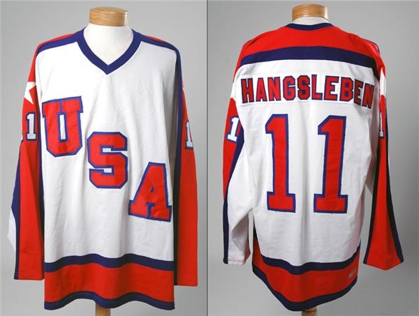A simple U-S-A tracks down the front of defenseman Alan Hangsleben's game-worn jersey from the 1981 Canada Cup. If the threading around the red letters looks stressed, it's because the Americans faced Canadian and Soviet squads hellbent on a grudge match against each other. Hangsleben's NHL career was peaking around the same time as this international competition, best known for being delayed a year because of the Soviet invasion of Afghanistan and for helping to introduce Wayne Gretzky to the world. Cooper polyester features always-welcomed patriotic touches, including a white star on the red and blue sleeve piping. Grime and stick smears on the white part of the jersey show that Uncle Sam wasn't ready to cry uncle despite the tough competition.
