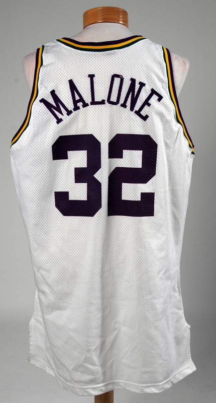 To list all of his accomplishments would force us to create a catalog solely dedicated to him. Simply put, the Mailman was one of the greatest and clearly one of the toughest ever to lace up. His "home" white jersey is screened "Utah Jazz 32" on front and "32" on the reverse, sewn above is "Malone" in purple tackle twill. The tail is double tagged "Champion [size] 50" and "Designed & Tailored Exclusively For The Utah Jazz-95/96-Body Length +3". One of only a handful of game-used Karl Malone items to come up for auction. Good use.
