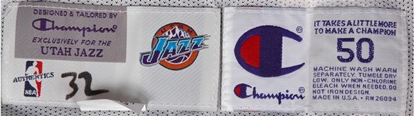 For almost two decades Stoackton and Malone connected to form one of the most lethal one-two combos in NBA history. So it is only appropriate now that we should offer these two warm ups together. The black "away" jackets are sewn with a "Jazz" patch on the left chest and embroidered with the NBA logo and Champion "C" logo on the right chest. On the back is a large team logo and second "C" logo. Triple tagged on the inside of the neck: Malone-"Champion [size] 50" / "Exclusively For The Utah Jazz" (with "32 written in black marker), and "3" X-Length Body-2" X-Length Sleeve" flag tag. Stockton-"Champion [size] 42", "Exclusively For The Utah Jazz" (with "12" written in black marker), and "2" X-Length Body-1" X-Length Sleeve" flag tag. Matching pants are [size] "40" with "2" X-Rise 7" X-Inseam" flagtag (Malone) and "32" (Stockton) both are again written with their numbers in black marker. Both display equally impressive use.