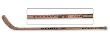 This is the rarest game used Wayne Gretzky stick we have ever offered. A true "rookie" stick, used by Wayne while with the Edmonton Oilers of the World Hockey Association during the latter part of the 1978-79 season. This Koho Custom Pro 221 model stick is factory stamped "GRETZKY" below the knob with Wayne's number "99" marked in black high up on the shaft. The handle is taped in the manner of later Gretzky gamers, with white over the heavy black 'bulldog" tape. Over time, the oils from the black tape have discolored the white and turned it to a light brown. The one or two strips of blade tape are no longer there but reside has been left behind to mark its place. This stick displays heavy game use with numerous puck and stick marks and was in the end demoted for use in warm-up as it has the word "practice" written in marker on the shaft. Slight game damage on the blade has been repaired using a few wraps of clear repair tape; a practice found on other Oilers sticks from the period. Interestingly, the repair tape wrap starts off on an angle in a style Wayne maintained for many years to come on his game sticks. The stick has one slight cosmetic glitch in the form of a one-inch saw groove or notch on one side of the shaft. It's an often-told story around Oilers circles. A rookie sports reporter, having faced a night of ritual hazing at the hands of the team, sought his revenge by taking a chainsaw to the stick rack in the locker room. Reportedly, only a dozen of these Kohos were produced for Wayne, and although photos exist of him using this exact model in 1979, this example is the first we have seen offered.