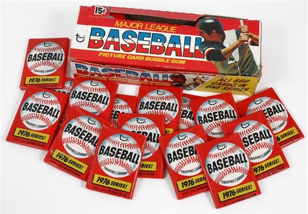 1976 served as a year of grand celebration as America celebrated its Bicentennial Anniversary as a nation. Topps produced its 660 card set in 1 series and proudly decorated its wax boxes in Red, White & Blue. Several stars made their Rookie Card debuts including HOFer Dennis Eckersley # 98, Ron Guidry and current Mets Manager Willie Randolph. The most sought after cards include those of Hank Aaron , #'s 1 & 550 who made his last contemporary card appearance as well as Ryan, Rose, Winfield, Schmidt, etc. This 36 ct. display box is in VG/VG-EX condition (the perforation has been broken on top). The box contains 36 unopened wax packs (some show minor wear). Packs average EX-MT to NRMT.