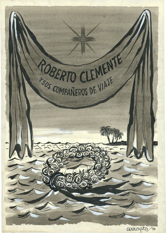 Mourning took on all forms when Roberto Clemente perished in a plane crash on New Year's Eve 1972. This 14 x 24" original pen and ink (VG-EX) sums up his Puerto Rican homeland's feelings the morning after he and others were bound for Nicaragua to help earthquake victims, but plunged into the sea just off the Puerto Rican coast. Clemente, revered by the baseball world and worshipped by fellow Puerto Ricans and the entire Hispanic community, is given an at-sea ceremony with a wreath floating over the whitecaps. "Roberto Clemente And Fellow Voyagers," the funereal curtain reads, as a cross or star shines above to guide them to their final resting place. The work is delicately employed on white artist's board, brilliantly deploying shades of white, gray and black. Clemente's body was never found, so this would have served readers as a tangible goodbye.