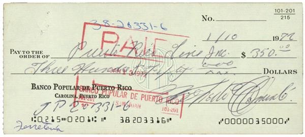 Roberto Clemente's signature (8.5/10) on a $350 check to the Puerto Rico Line Co. Wonder what the Banco Popular employees who processed this Jan. 10, 1972-dated check thought when they saw the name. The check cleared with the requisite stamping on the front and back and an additional handwritten note that the money be deposited to pay "PR Line Inc.," a shipping firm. There's something compelling about getting a peek into the personal lives of legends, even in an everyday business transaction. NRMT sig, check has a staple hole o/w EX-MT.