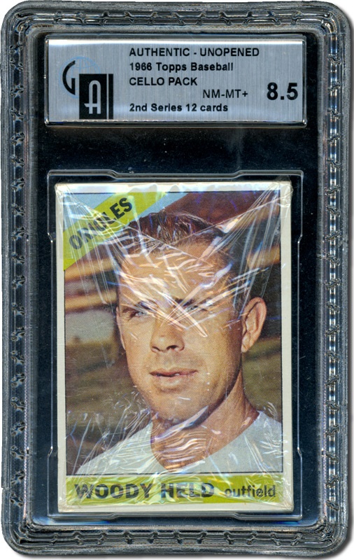 In 1966, Topps produced a 598-card set in five series. This 12-card Series 2 cello pack grades GAI 8.5 NM-MT+. Series 2 contains cards of several HOFers, most notably: #110 Ernie Banks, #120 Harmon Killebrew, #126 Jim Palmer rookie, #160 Whitey Ford, and #195 Joe Morgan.