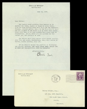 One of the pioneering brothers of aviation writes to the son of the other. Typewritten note on Orville's personal letterhead offers a summer job to his nephew. Closes, "Affectionately, Uncle Orv." Signature is in perfect dark black ink. Includes original mailing envelope, noting recipient as "Wilbur Wright, Esq." NRMT.