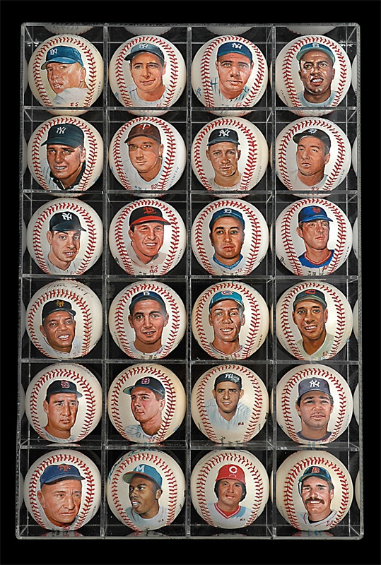 Artistry, novelty and that undefined element of wow! go into Irwin Sadler's hand-painted baseball collection (MINT). Twenty-four intricately rendered portraits of all-time greats peer out between the seams, and 17 from this 1988 set signed their ball (9/10). Each painting is a masterpiece.The worlds of art and baseball rarely collide into such brilliance. A dugout of stars is bound to appeal: Henry Aaron (signed), Casey Stengel, Pete Rose (signed), Ted Williams (signed), Joe DiMaggio (signed), Sandy Koufax (signed), Don Mattingly, Duke Snider (signed), Stan Musial (signed), Willie Mays (signed), Babe Ruth, Lou Gehrig, Yogi Berra, Bob Feller (signed), Roger Maris, Ernie Banks (signed), Harmon Killebrew (signed), Mickey Mantle (signed), Al Kaline (signed), Nolan Ryan (signed) and Whitey Ford (signed). Compartmentalized lucite display case preserves the magic.