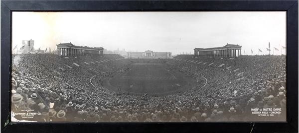 A sea of fedoras surrounds the pageantry of Soldier Field in this impressive photo panorama of the 1928 Notre Dame-Navy game. Just a glimpse of this fabulous 27 x 67" original image (VG-EX) topped by the columned facades of the great stadium makes you want to "cheer, cheer for old Notre Dame." At 32 x 73" in its wood frame, the wood-backed picture is a wall-anchoring piece of history. White imprint at lower right reads: "Navy vs. Notre Dame Soldier Field-Chicago October 13, 1928." The lower left has the copyright stamp Chicago-based Kaufman & Fabry Co. A crowd of 120,000 that day watched Notre Dame beat Navy, 7-0. Don't take after the Middies and get shut out in this deal.