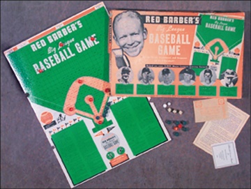 One of the classic games of the 1950's. Named for the announcer that covered both the Yankees & Dodgers over the course of his career. Cover shows testimonials from the great players of the New York game. Photographed at bottom are Pee Wee Reese, Casey Stengel, Preacher Roe, Carl Erskine, Tom Henrich and Burt Shotton. By G&R Anthony. The box measures 13x20". Dated 1950, it is complete and has a couple of lid tears, o/w VG. This game is fondly remembered by those who played it as kids as being something truly special.