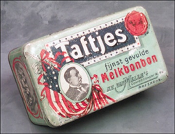 Never before seen Dutch tin for a brand of candy named "Taftjes." Circa 1908. These milk chocolates picture a wonderful image of recently inaugurated President Taft on the lid. He is adorned with American flag and beautiful colors on all sides. Measures 9x5.5x4" and overall strong VG-EX.