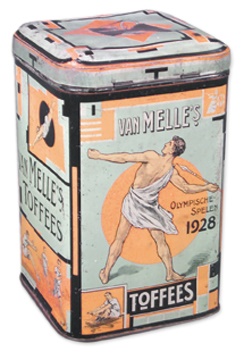 An art deco masterpiece from the Dutch confectioner who marketed his sweets in this terrific tin box. Images of various athletes cover the sides and top, with the manufacturer's name stamped on bottom. Paint wear and some denting is to be expected, and only serves to give the piece a good vintage patina.