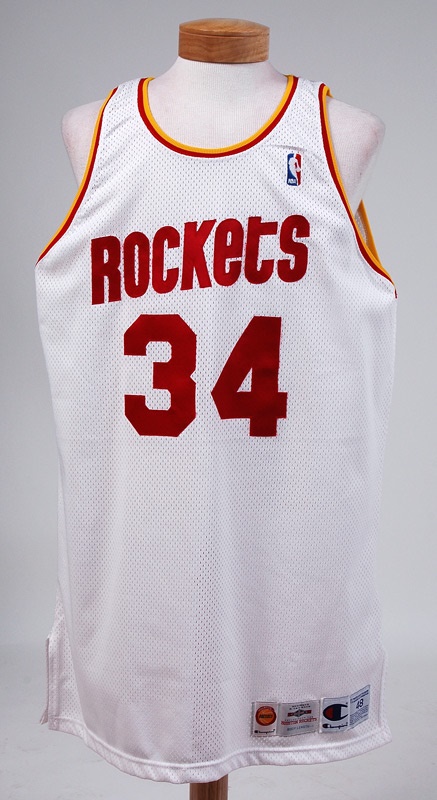 This Rockets jersey, which still causes nightmares for Patrick Ewing, was worn by Hakeen "The Dream" and autographed during the 1994-95 championship season. Signature is on the diagonal slant of the "4" in his "34" on the back, adding a #34 handwritten flourish under his signature (9/10). Two shirttail tags tell all: a "Champions [size] 48" with "+4 body length" -- that's long, trust us. The home poly mesh has smart Rockets design with "Rockets" in red stitched across the front above a large "34". Each letter in Olajuwon is sewn individually on the back. NBA logo on left shoulder strap. Moderate use with repeated washings. LOA from the Rockets' equipment manager.
