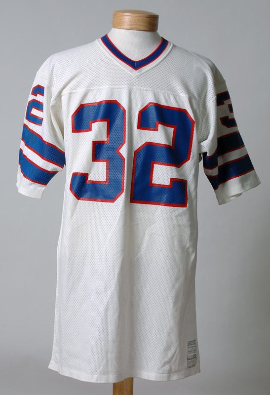 O.J. Simpson's game-worn jersey from the mid'-1970s is an irresistible combo of the famous and infamous. It makes one heckuva souvenir, too. Of all the collectibles you acquire, this will be the talker, both for the baggage that comes with it and its heavy use. Ol' No. 32's large Sand Knit tailored especially for the Buffalo Bills -- like it says on the front shirt tail labels -- has so many heavily sewn repairs that they look like stains from afar. There's a blood and dirt stain next to the "2" on the front (we won't go there) and a few others scattered about. The silkscreen arm rings are scratched. It's a terrific gamer even without the nameplate Simpson stitched to it, but who could ignore the name? And who could ignore that despite being tried for murdering his wife, Simpson might have been the most exciting running back ever? This white-mesh poly Bills jersey housed one of the sport's great entertainers.