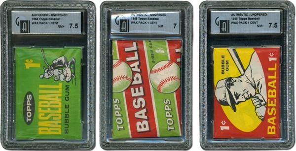 One of the most difficult and desirable one cent single card "penny" packs in the hobby today is the 1955 Topps offering. This spectacular set, highlighted by the #164 Roberto Clemente RC, also includes first year examples from #123 Sandy Koufax and #124 Harmon Killebrew. Add to it Hall of Famers #2 Ted Williams, #47 Hank Aaron UER, #50 Jackie Robinson, #193 Willie Mays and #198 Yogi Berra, and its no wonder why this item is at the top of every collector's wish list. Graded NRMT (7) by GAI. #10 Mickey Mantle, #50 Wilie Mays, #150 Stan Musial, #163 Sandy Koufax, and #202 Roger Maris are just a few of the names and numbers you may find in the 1959 pack. Graded NRMT+ (7.5) by GAI. Finally, the NRMT+ 1964 specimen (GAI 7) holds possibilities such as #50 Mantle, #125 Pete Rose, #150 Mays, #200 Koufax, #300 Aaron, and #331 AL Bombers. Three packs total.