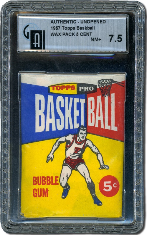 This 1957 Topps wax pack represents the company's first, and last, until more than a decade later, endeavor into basketball. Packed with the rookie cards of Hall of Famers, it has become one of the the most coveted unopened materials in the hobby. First year cards from: Bill Russell, Bob Cousy, Nat Clifton, Bill Sharman, Paul Arizin, Dolph Schayes, Tom Heinsohn, Bob Pettit, and Maurice Stokes are possible. Graded NRMT+ (7.5) by GAI. A rarity among unopened packs. Even fewer boast such quality.