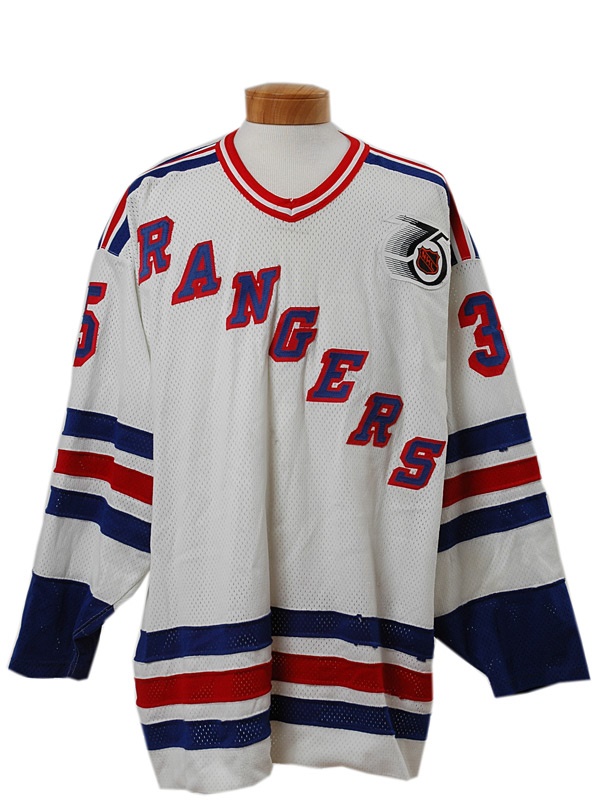 Mike Richter was the most beloved New York Rangers goalie since Ed Giacomin. Game-used jersey from the 1991-92 season shows a lot of stress in the seams, especially on the bottom of the sleeves where he wore his blocker and glove. The NHL's 75th anniversary patch looks great above the tumbling Rangers script down the front. Gerry Cosby and CCM tags are intact on the collar and three-square CCM decal and NHL patch are on the shirt tail of white mesh with red and blue numerals and letters. The fat No. 35 is there on the back under his name⦠just the third number to be retired by the Rangers. Richter was that good and that important to the franchise. In the year he wore this jersey, he posted a 23-12-2 record, and the Rangers made the playoffs. And you know what happened soon after. In 1993-94, he set a franchise record with 42 wins in a season, and the Rangers ended the "Curse" and won the Stanley Cup (their first in 54 years). In 2001, Richter passed none other than Ed Giacomin to become the Rangers all-time leader in victories.