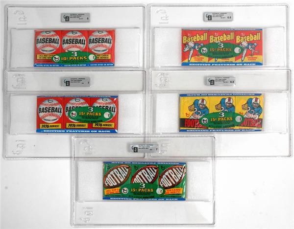 Seems like 1970s tray packs are more desirable than ever but tougher to find as well. Offered is a nice assortment of mid- to late-seventies tray packs includes: 1) 1974 Baseball-graded EX-MT (6) by GAI. 2) 1974 Football-graded NM (7) by GAI. 3) 1975 Baseball-graded EX-MT+ (6.5) by GAI. 4) 1976 Football-graded EX-MT+ (6.5) by GAI. 5) 1976 Baseball-graded NRMT (7) by GAI. 6) 1975/76 Hockey-EX+. 7) 1978 Baseball-EX-MT. 8) 1979 Baseball-EX-MT. 9) 1979 Football-EX-MT. Nine tray packs total. Please don't open these!