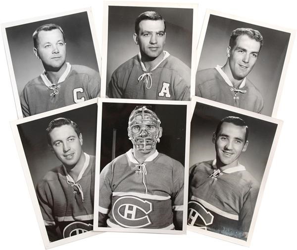 Stunning near set of portrait photographs by one of the most lauded hockey photographers of them all. 22 images are each 5x7” and carry the renowned raised cartouche of the “David Bier” Studio. Also stamped by him on the verso they are each identified: Plante (2), H. Richard, Beliveau, Geoffrion, Harvey, Pronovost, Talbot, Langlois, the Tremblay’s, Goyette, Hicke, Rousseau, Connelly, Hodge, Johnson, Bonin, Turner, Moore, Marshall, and Backstrom. Highlights are the two versions of Jacques Plante, one with pretzel mask, one sans mask. Like new, NRMT.
