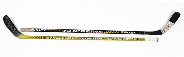 Sibling sampling of sticks, both with some choice game blemishes, the original tape on the handle, and their autographs. Pavel signed (8.5/10) "To Rick Your Pal P. Bure 10" on the white blade tape of his Bauer Supreme Reactor. Valeri signed (8/10) his Easton Synergy in silver on the black blade, "Rick, V. Bure 8." Pavel used his stick when he was with the Canucks. Valeri's is from the Canadiens.