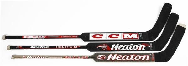 Winner of two Vezina trophies as the NHL's best goalie, Martin Brodeur has been a leader with the New Jersey Devils since 1991, leading the club to three Stanley Cups. This group of three of his goalie sticks consists of Heaton Helite SIX model, Heaton Helite IV model and Heaton CCM model goalie sticks. All are graphite reinforced wood and fiberglass with black, white and red painted manufacturer's information. The Helite IV stick is stamped with "M BRODEUR" and "1998" in black ink, the CCM stick is stamped "M. BRODEUR" and "2001" in black ink. The Helite IV stick is signed with the player number "30" in black marker rating a 6-7 on the blade. Each stick is taped on the blade and on the knob. The sticks show excellent game use with great wear and puck marks. No cracking or damage. The sticks were obtained directly from Martin Brodeur.