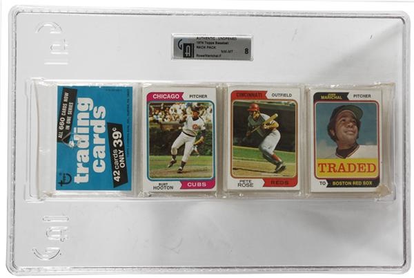 Charlie Hustle leads off and Juan Marichal is up next on the top of this 1974 Topps rack pack (42 cards) that could also include #20 Nolan Ryan, #80 Tom Seaver, #130 Reggie Jackson, #250 Willie McCovey, #283 Mike Schmidt, and #456 Dave Winfield (RC). Graded NM-MT (8) by GAI. Equally impressive is the 1975 rack (42 cards) that exhibits #620 Gary Carter's rookie card along with #300 Reggie Jackson on top. Possibly inside are #223 Robin Yount (RC), #228 George Brett (RC), #260 Johnny Bench and #370 Tom Seaver amongt others. Graded NM+ (7.5) by GAI. A great pair of mid-70s racks with stars on top.