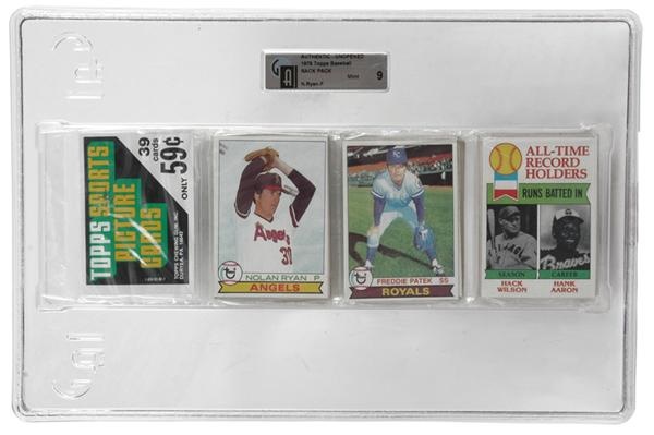 Five unopened offerings all featuring one of baseball's premiere fireballers, Nolan Ryan, directly on top. 1) 1973 Topps rack pack (54 cards) with #220 Nolan Ryan, GAI 7.5 NRMT+. 2) 1978 Topps cello pack with #6 Nolan Ryan Record Breaker card, GAI 8.5 NM-MT+. 3) 1978 Topps cello pack with #206 Ryan Niekro Strikeout Leaders card, pack has 2" slit on front which does not affect cards, EX. 4) 1978 Topps cello pack with #400 Nolan Ryan, GAI 9 Mint. 5) 1979 Topps rack pack (39 cards) with #115 Ryan, GAI 9 Mint.