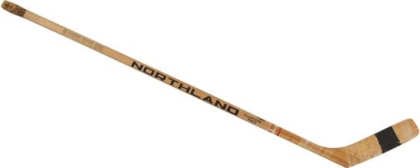 One of the most consistant scorers in the NHL in the 1950s and 1960s, Alex Delvecchio spent his entire 22 season NHL career with the Detroit Red Wings. Together with teammate Gordie Howe, he gave Detroit a feared offensive line. Delvecchio helped the Wings to the Stanley Cup as a rookie in 1952, and again in 1954 and 1955. A durable player, Alex played over 1500 games for Detroit, retiring in 1974 with 456 goals and 1281 points in his NHL career. He was elected to the Hockey Hall of Fame in 1977. This Northland Custom Pro stick has the knob taped and four wraps of tape on the straight blade. The celluloid accent stripes of red and white only partially remain. The stick is stamped “Delvecchio” and his number “10” in black ink. There are two cracks on the tip of the blade, and the tape on the knob is extremely worn and frayed. The stick shows good game use with puck and board marks.
