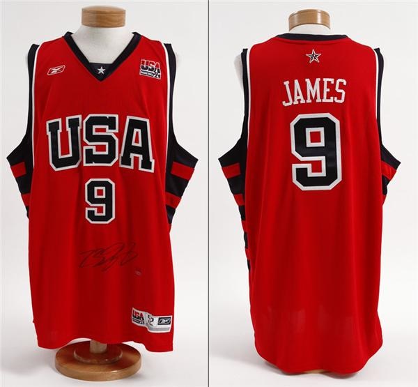 Group of 10 Upper Deck Authenticated Limited Edition LeBron James Autographed 2004 USA Olympic Team jerseys. The 2003 National High School Player of the Year, James joined the Cleveland Cavaliers in 2003-04 and won NBA Rookie of the Year honors. He averaged at least over 20 points, 5 rebounds and 5 assists per game, only the third rookie (after Oscar Robertson and Michael Jordan) to do so. As a member of the USA team, LeBron won a Bronze Medal at the 2004 Olympics. The red jersey has the Reebok USA Basketball tag with the jersey size "52" on the lower left tail, and additional manufacturer's tagging on the inside back collar. There are embroidered USA Basketball logos on the left breast and beneath the back outside collar, and an embroidered Reebok logo on the right breast. On the front is "USA," with the player number "9" below that and on the back, both in blue on white tackle twill. Across the back is "JAMES" in white tackle twill. LeBron's signature in black marker grading 9/10 is below the front number, with the limited edition information (number x of 123) and authenticity sticker next to the signature. All ten jerseys are in Nm-Mt condition and come with an Upper Deck COA in the original Upper Deck boxes.
