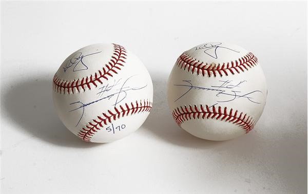 Five exquisite horsehides dually signed by the dynamic dinger duo that captivated baseball in '98. It's still hard to fathom that, between them, Big Mac and Slammin' Sammy hit 136 homers, shriveling Maris and Mantle's once-meaty 117 in '61 into table scraps. Of course, what McGwire and Sosa had on their own pregame table is open to speculation, but the tingling vibe of '98 will always be a Homeric tale (no, not Homer Simpson) pitting 2 gods in a personal (and in this case very friendly) war in the Summit that bred peace, love and togetherness all across America. The balls were signed identically, with McGwire on a side panel and Sosa on the sweet spot with an added "#21". Two balls are part of a limited-edition sets, one numbered "1/70" and the other "5/70". Signatures in blue pen and Official Major League Baseballs are NRMT and have the MLB logo sticker on them, and all come with COAs.