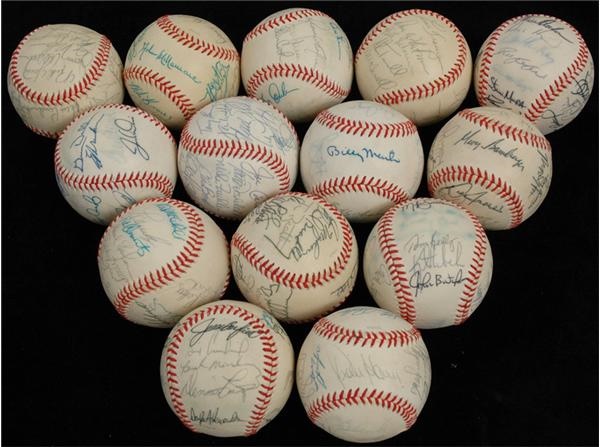 Complete set of all 14 American League team-signed baseballs from the golden year of 1985. These OAL baseballs have been signed by team members in black, blue and green pen. The balls grade about EX overall and have 20+ signatures per ball (a few lesser players may be secretarial). Includes: Oakland A’s, Seattle Mariners, Cleveland Indians, Kansas City Royals (26 sigs overall VG-EX), California Angels, Boston Red Sox, Chicago White Sox, New York Yankees (21 sigs, overall VG-EX), Baltimore Orioles, Detroit Tigers, Texas Rangers, Minnesota Twins, Toronto Blue Jays, and Milwaukee Brewers. The balls average VG-EX condition with some better, some worse.