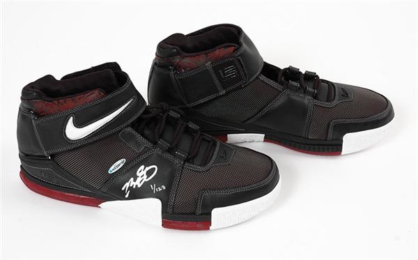 Great pair of limited edition (the elusive #1 in an edition of 123) LBJ Nike Air Zoom II sneakers signed once in blazing silver sharpie "23 LeBron James". Near perfect, the autograph would have earned a grade of 10/10 had it not been for a small break in the "2" of the "23". This particular pair, aside from being Mint, is especially irresistible because it was the very first duo of this small run to be signed. Includes all corresponding documentation and holograms along with its original box from Upper Deck.